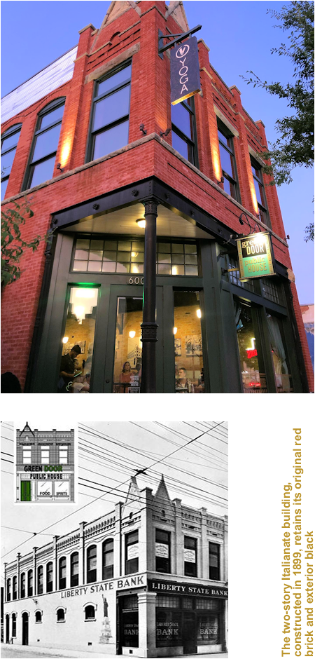 It is the only freestanding restaurant in the Farmer’s Market, conveniently located a few short blocks from the heart of downtown and Deep Ellum, and highlighted by a 1,200 sq. ft. shaded patio with great views of downtown. The Green Door Public House occupies the first floor of the twostory brick building built in the late 1800’s. Its history includes four saloons during the early 1900’s and was remodeled and occupied by Liberty Bank in the 1920’s when prohibition began. During prohibition, speakeasy owners would paint their doors green to alert customers that they had the “goods.” Guests will feel immediately welcomed by the intimate décor and comeasyouare environment. This new refuge for food and spirits will not only appeal to our urban neighbors but also to those visiting the Farmer’s Market.